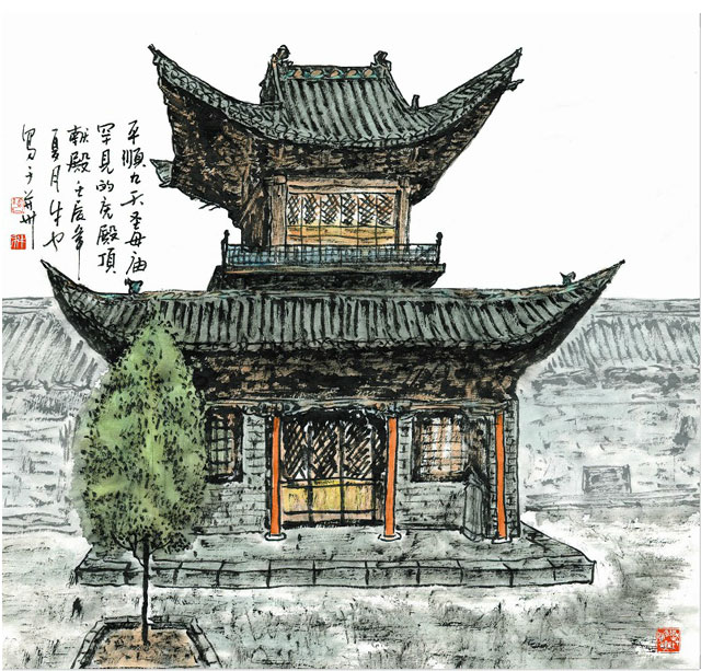 重修于清同治四年的戏楼面阔三间,进深四架椽,单檐歇山顶,圆柱方额,斗拱华丽。顺着秦河堂手指的方向看去,戏楼台上、背墙与侧门框上留有许多艺人戏班的题记,左右台前还有前人所绘的八幅花鸟条幅画,能辨认出的有“哪吒”“妲己”“包公”戏图,观之,仿佛回到遥远的古庙会中,“现在有记录的,民国时期屯留县的清连传戏班、潞城冯村的三乐班、壶关的三乐义班等有名的戏班子,都在这个戏楼上唱过戏。”