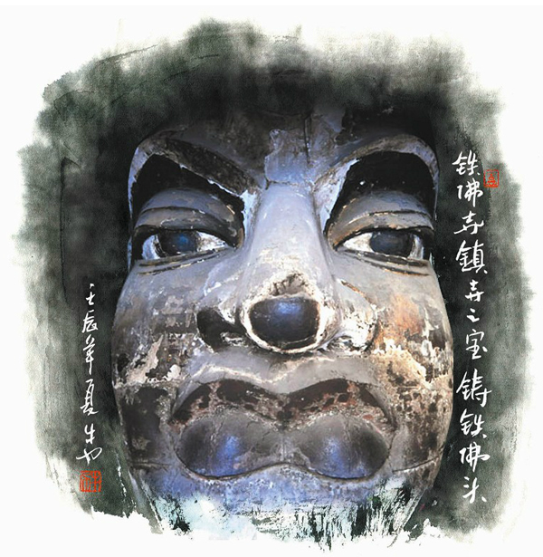 金顶宝塔的一层,就是铁佛寺的镇寺之宝——铸铁佛头了。铁佛寺之名,正由它而来。