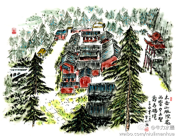 过“九杆旗”沿台阶款款而下,是东、北、南峰交汇形成的一处平台,红墙绿瓦的古刹圣寿寺就坐落在这群山环抱、翠绿掩映的深谷中。
