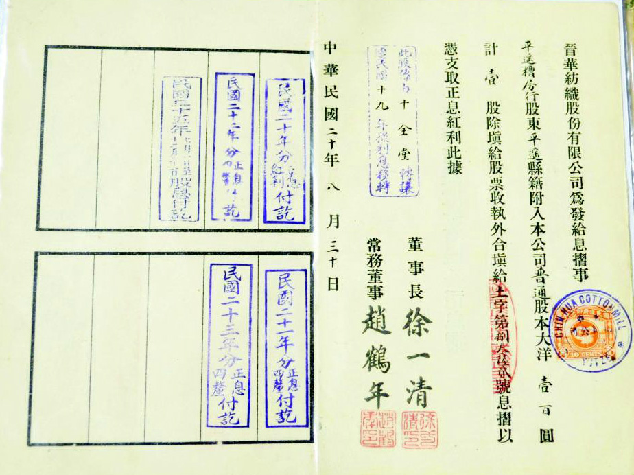 晋华纺织厂是山西近现代重要的工业遗产,创始于民国十年,曾是山西规模最大的国有纺织厂。 据晋华纺织厂厂史记载,1919年,榆次商业资本家贾俊臣、徐秉臣、郝星三与山西银行经理徐一清、省财政厅长崔文征,以及榆次县乡绅赵鹤年等集资150万元,在榆次城北门外创办晋华纺织股份公司。1924年,公司正式建成投产,改名为榆次晋华纺纱厂。1948年该厂被人民政府正式接收管理,成为山西轻纺工业的代表。 这是三个记载着晋华纺织厂发展历史的文件。最右图是民国九年二月就成立晋华纺纱股份有限公司事,上报县知事公鉴一份,并附有筹备期间发布的招股章程及发起人名单; 中间图为民国二十年三月二十五日晋华纺织股份有限公司股票一张,为普通股一股,市值国币一百圆,盖有董事长徐一清和常务董事赵鹤年的名章,内容是“德寿堂股东山西省文水县附入本公司股本大洋壹百圆,计壹股,合填给土字第柒壹叁伍号股票息折为证。” 左侧图为民国二十年八月三十日晋华纺织股份有限公司的“晋华纺织股份有限公司为发给息折事”一份,“平遥糟房行股东平遥县籍附入本公司普通股本大洋壹百圆,计壹股,除填给投票收执外,合填给土字第捌叁陆贰号息折,以凭支取正息红利,此据”,即股东“平遥糟房行”可凭此支取正息红利。 目前,晋中市文物局已将晋华纺织厂作为重要的近现代工业遗产推荐申报第七批全国重点文物保护单位。据文物局的同志介绍,如果今年下半年通过了国务院的正式审批,晋华纺织厂将成为山西省第一处近现代工业遗产类全国重点文物保护单位。到那时,对这三件藏品,将会有更多、更详细的解读。 ■ |