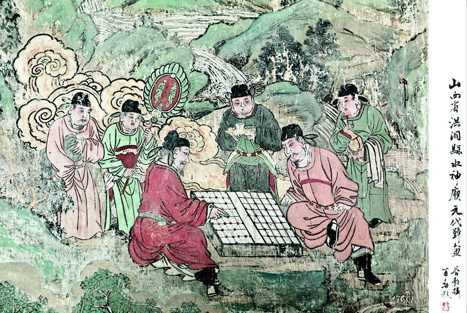 下棋图,山西省洪洞县水神庙元代壁画。位于明应王殿北壁上部,规模不大的下棋图题材新颖,人物传神。背景上松林葱郁,溪流涓涓,幽静深邃,为画面增添了无限的情趣。