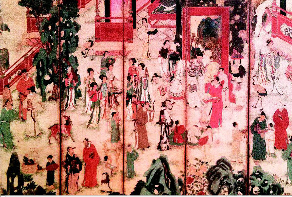山西省芮城县明代郭子仪拜寿图。场面宏大,人物众多,在明人绘画作品中极为罕见。画中山林台观,庭院房舍,人物鞍马,山石花草,繁复精湛,特别是人物线条流畅,神采生动逼真。无论从布的材料,颜色,风格,人物场景布局都堆积着古雅富丽,堪称传世佳作。