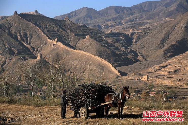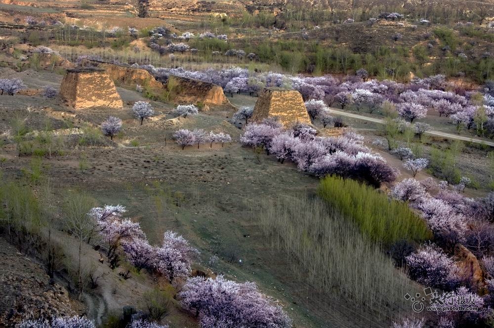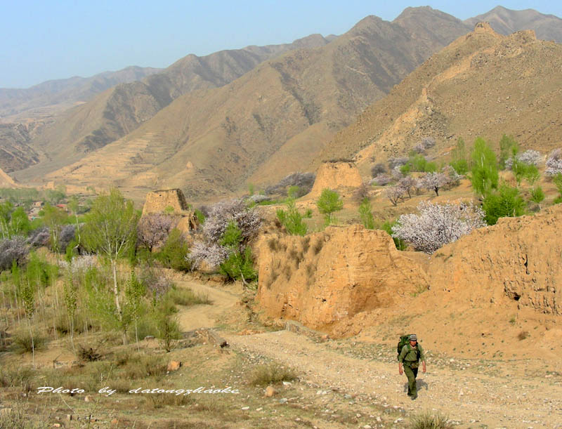 烽烟远去,城楼尽毁,只有残墩断墙相望连绵,一派苍凉幽远的塞外风情。长城脚下,黄土筑就的农家院落傍山而建。杏花时节,绿抹山腰,花掩村庄。长城脚下,头上裹着厚线围巾的农妇们,赶牛耕地,面色黝黑的农夫站在犁耙上,把草根、庄稼根耙出来,为播种做准备。据说这样做还能保持土壤中的水分,利于种子生长。让人感叹农民的勤劳与智慧。