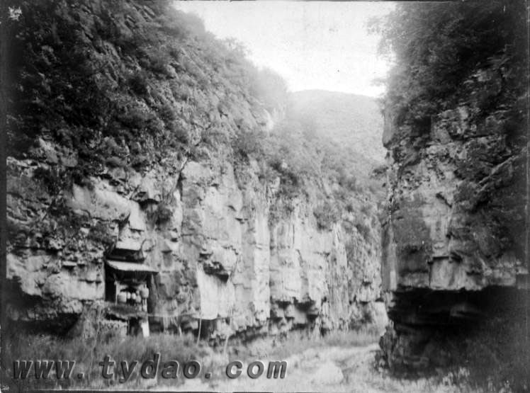 上图:1911年12月,救援队经文水、汾州,经一条名为“三十里桃花洞”的古道前往吴城、军渡, 此图是1909年9月克拉克考察队从军渡返回太原途经“三十里桃花洞”石佛湾时由索尔比拍摄,照片左下侧为北朝石窟 下图:2015年5月1日,张珉拍摄的石佛湾,古道已废弃,石窟窟檐已毁,佛像法相依旧庄严