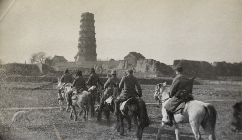 1911年12月6日,索尔比救援队进行途中,照片中出现了他们携带的名叫“吉米”的赛特种猎犬。 经杨杰垄上行确认,此处为文水县梵安寺,古塔名叫上贤塔