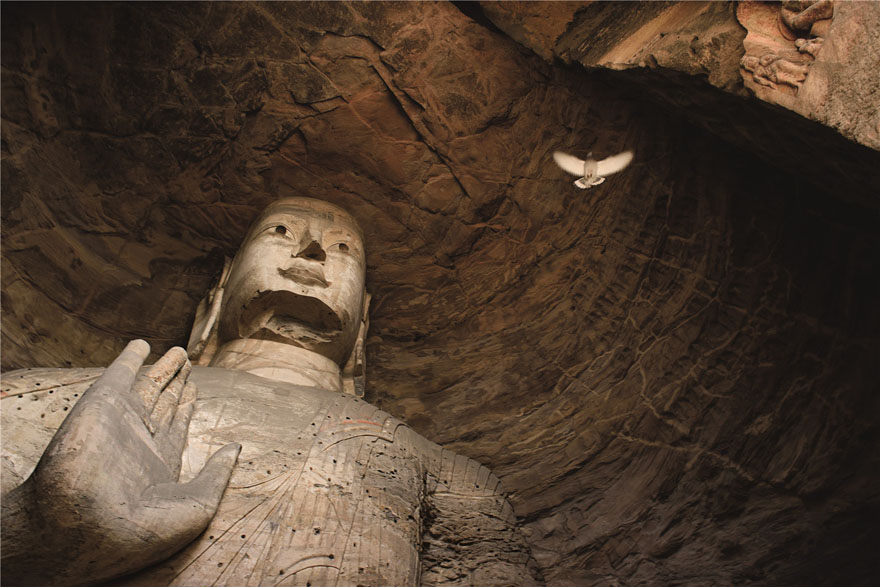 开凿最早的昙曜五窟中的五尊大佛是云冈艺术的典型代表。 昙曜五窟之一的第19窟内的大佛法相庄严,似凝眸远视,和衔草归来的白鸽相映成趣。