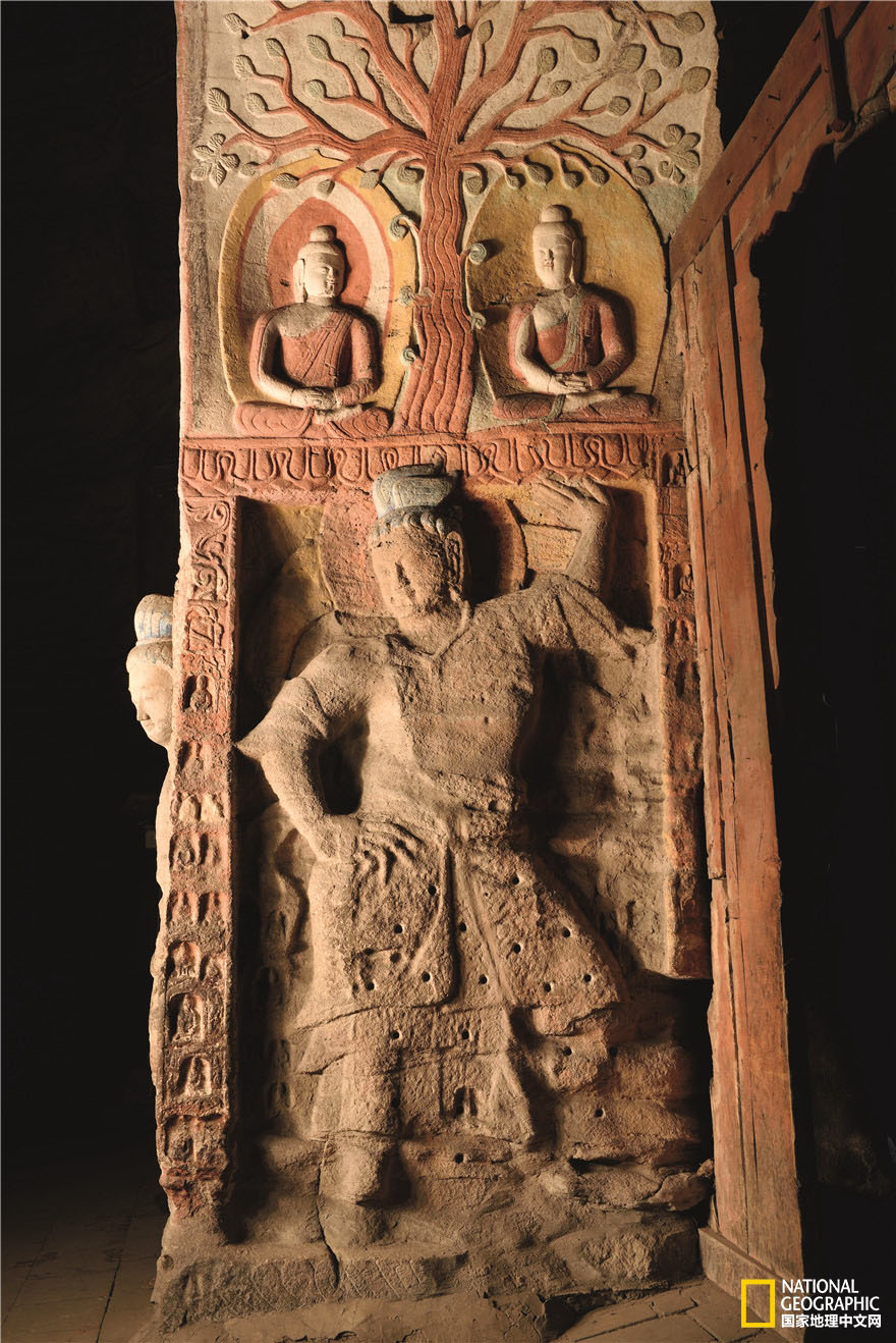 第5窟窟门西壁雕刻:上部表现的是《妙法莲花经》中的释迦、多宝佛二佛并坐于枝叶繁茂的菩提树下; 下部的护法神王头顶高髻,身着厚重铠甲,脚穿长靴,威风凛凛,是犍陀罗艺术中常见的贵霜武士装束。