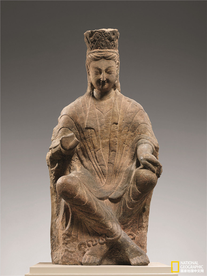这尊头戴高冠、面露微笑的交脚菩萨石像高146.1 厘米,原凿刻于16-1 窟北壁上层,1920年代初被盗凿,现存美国纽约大都会博物馆。
