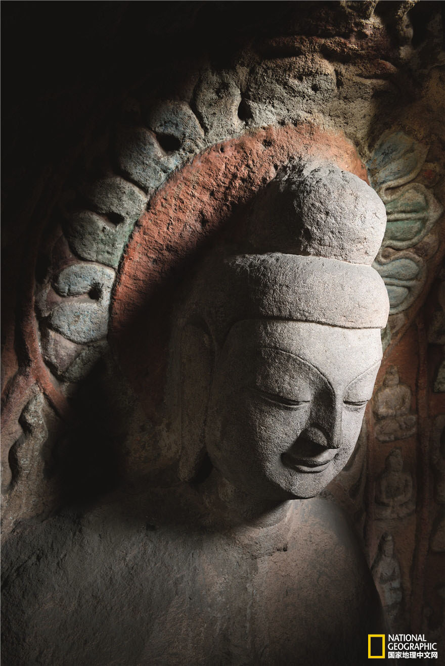 第5窟前壁一尊隐匿于窟檐楼板间的石佛,是云冈石窟众多雕塑中最为打动人心的佛像之一,也是云冈雕刻艺术中最具代表性的作品。 佛像高肉髻,面容清矍,鼻高而直,两翼分明,微微颔首,平和内敛,体现了佛陀超凡脱俗的智慧之美。