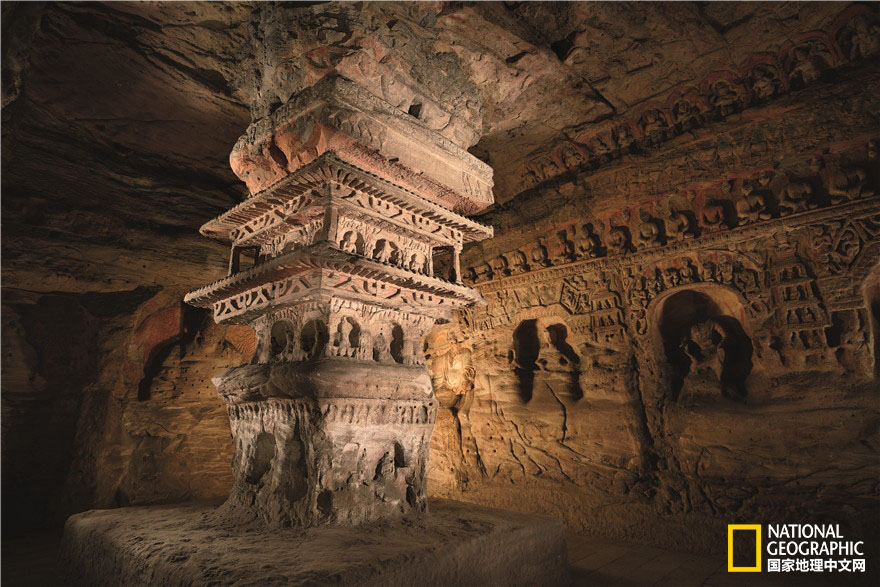 第2窟为中心塔柱窟,塔顶雕有华盖和须弥山。 塔,源于印度,汉末传入中国后,形成“上垒金盘,下为重楼”的多层楼阁式佛塔,是石窟汉化的一个重要标志。