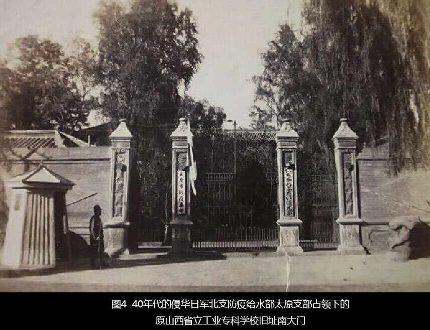 “北支那防疫给水部太原支部”,建立于1938年5月间,地址在太原市原西羊市街12号山西省立工业专科学校旧址(图3),1939年后对外使用“北支派遣(甲)第1856部队”的兵团文字符与通称号,有资料显示该部队也曾一度使用过“乙”即山西派遣军兵团文字符,具体时间待考。根据博友“湖蓝海夜空”提供的防疫给水太原支部大门照片(图4)来看,该部对外挂出的左侧牌子上写着“太原市防疫本部”,右侧的牌子上则用日文注记,初步判读为“いちかわぶたいほんぶ ”大意应“市川部队本部”,此处“市川”是否为照片拍摄阶段的部队长姓仍然待考。1945年8月日本投降前,潞安日本陆军医院与太原支部合并。 |