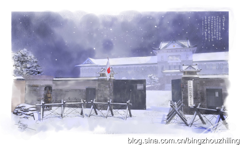 值此纪念抗日战争胜利70周年之际,特绘制《山西派遣军司令部复原图》以为纪(图1)。画面特别选取了雪中的日本军部大楼加以表现,以”浴雪“暗指”浴血“,反映了日本军队陷入敌后泥潭的困境以及山西抗战军民持久的血泪坚持。 |