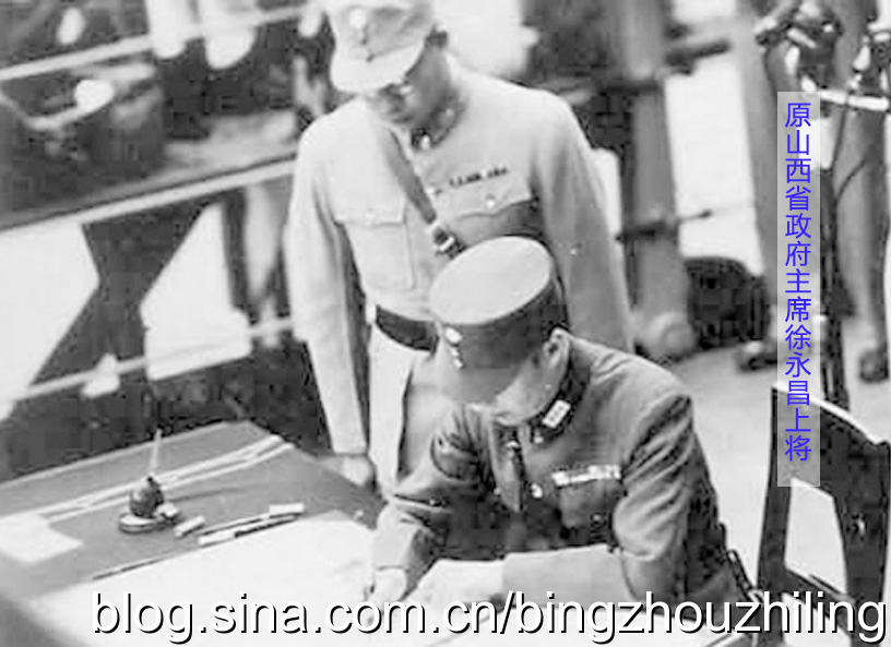 而历史有时候就是这样巧合,曾任第一军司令官的梅津梅治郎及其后任曾长期不遗余力的推行瓦解阎锡山的“对伯工作”计划,而最终梅津代表日本政府在美军密苏里战舰上签署了货真价实的降书,而代表中国参加受降仪式的代表恰是曾出任山西省政府主席的山西崞县人徐永昌将军。正如王炳文在1946年《中国抗战损失说帖》中所言:“各省遇战县数多少不一,山西省特多计六十一县......概括言之,山西境内不独争斗频繁,规模亦特巨大。”所以我们或许可以认为密苏里战舰上的受降式也是另一种意义上的“山西受降式”吧(图5)。当徐永昌代表中国在受降书上签字时,也包含了对八年中为山西民族独立献出鲜血与生命的人们的纪念、缅怀与旌表,或许也是对山西第二战区所谓秘密受降的反讽吧。 |