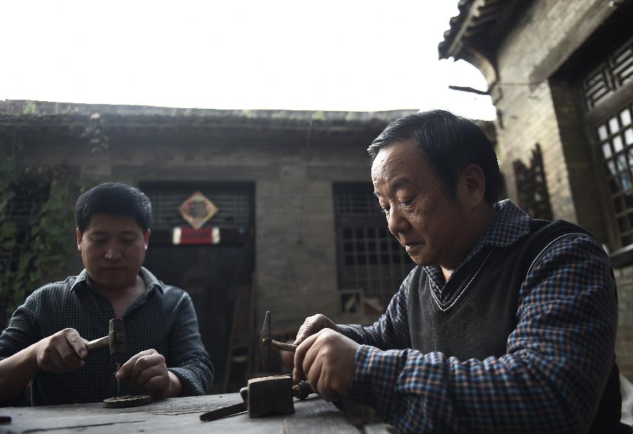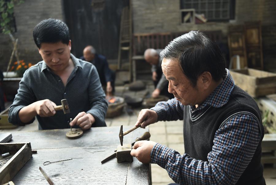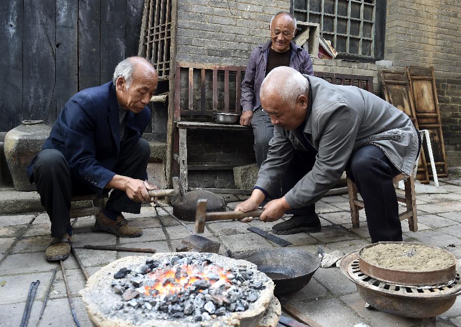 最后的手工制针人大阳镇的老匠人李双炉(左)和武来顺(右)在将钢条锤扁