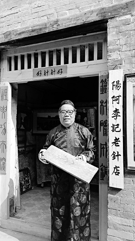 李连五站在“阳阿李记老针店”门前招揽顾客 |