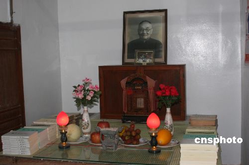 这是一座石砌墙、水泥顶的建筑,依山背风一溜五间,颇为结实,檐前的出厦是另外加的,红砖垒了柱,架起了一排塑压瓦楞板,可遮阳挡雨。房子的顶是平的,四周又加了女儿墙,从外观上看不出是窑洞。在窑洞的石砌前壁上,有一大理石小碑嵌在其中,上面的内容因时间仓促未及细看,但落款是主人的名字与图章,时间是民国39年11月11日,我想它应该是建筑碑记。当我在这里端详这座建筑的时候,原、曹二老并未进屋,他们在屋前的坪坝上来回走着,倾心交谈着什么。这座建筑从东数第二间是朝前突出的,突出的部分自然形成了一个进屋的过道,我们就是从这个过道的侧门进入种能洞的。屋内给我最突出的感受是阴暗、潮湿、憋闷,这可能是所有经常无人光顾的房子所特有的吧。但屋门上鲜红的春联又使人产生一种居家的温暖,后来听张先生讲,他是天天要过来看看的。一进屋的正厅,或者可称为堂屋(其实很小)是祭奠主人的地方,屋内虽然打开了电灯,但光线依然昏暗。张先生急忙找来一盏台灯插上,室内顿显亮堂起来。正面墙上,主人慈祥的遗容十分抢眼,遗像的两侧是一副挽联,上联书“主政近四十年三晋人心思旧泽,遗书逾百万字中华国运展新图”。落款人为张维翰,云南人,做过台湾当局“监察院”副院长。遗像前的供桌正中,摆放着主人的灵牌,灵牌的前面立着一帧当年主人去世后家属致祭的照片,供桌靠前的位置上摆满了主人一摞摞的遗著,有《世界大同》、《三百年的中国》、《感想录》等等。供桌上还放了一束红色的塑料玫瑰花,插在一只我们这里常见的汾酒瓷瓶里。屋子的四壁挂满了一些名流的题词和主人的照片,题词有孙中山题写的“博爱”(复制于大陆阎故居),黄少谷题写的“日星河岳”,孔德成题写的“勋望长昭”,郝柏村题写的“耆德之勋”。