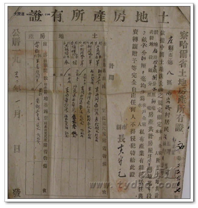 上面这张地契订立于民国十九年十一月十四日,这一年,祖父三十三岁,从李世俊手中购买了柳河的十亩旱地,花费大洋二百二十五元,二十年后,在应县县府颁发给祖父的《土地房产所有证》中,还可以看到这块土地,只是面积变成了五亩多,可能是其间出卖过一部分。 |