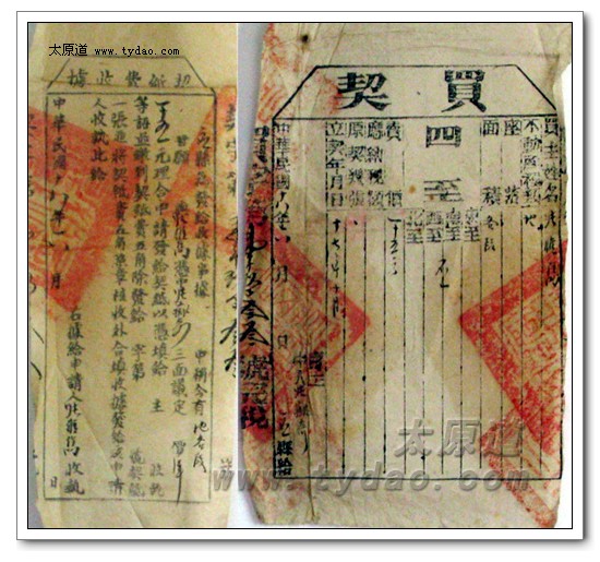 这是一份正式的官契,填写在印刷版的正式契纸上,编号为买字第壹玖参参号,两侧骑缝处均盖有大印。官契的颁发时间是民国十八年六月,立契时间为民国十七年十月,买价为十五元,从时间和买价推测,爷爷在原地契丢失后,以村长张岳奇为公证人补立了前面的那张地契,白契上虽然加盖了大印,可能是仍不放心或程序上的需要,又再次补办了正式的官契。 |