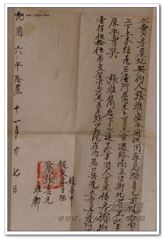 民国六年阴历十一月二十七日,距分家仅仅一年,二爷爷张维宓因使用在急,将自己前院西南房一间,卖与祖父张维隽永远为业,同人言定售价一百五十五吊,笔下交足,并不短少,杜绝在内,恐口无凭,立卖房产约为证。 |