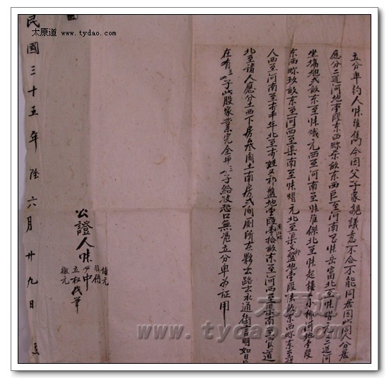 民国五年(公元1916年)阴历十一月十九日,祖父时年二十岁,在亲族赵喜忠、赵日旺、李步凤以及三位公证人张维墉、张春元、张维彬的主持下,曾祖父的四个儿子张维馨、张维宓、张维隽、张维杰按四股均分了家产,祖父张维隽共计应分水旱地十二段七十五亩半,前院房屋西畔以及西院房屋一所。在这包房地契中,我还发现了另一份分家契约,它的持有人是祖父的二哥也就是我的二爷爷张维宓,二爷爷共计应分水旱地十二段六十八亩半,后院房屋东畔以及东院房屋一所。 |