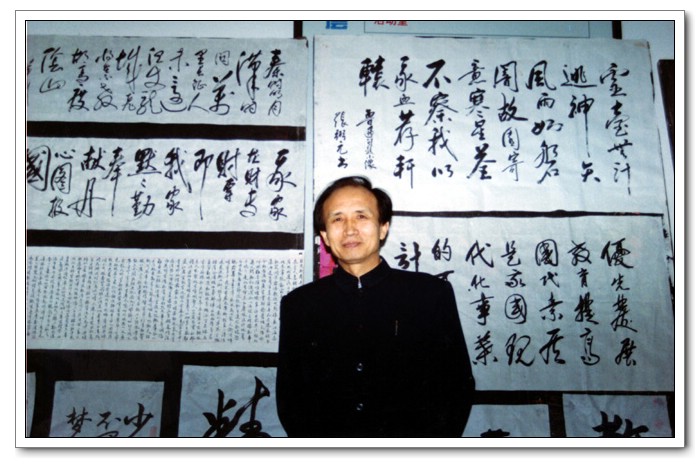 1996年3月,父亲在财专书法展览的的展板前留影
