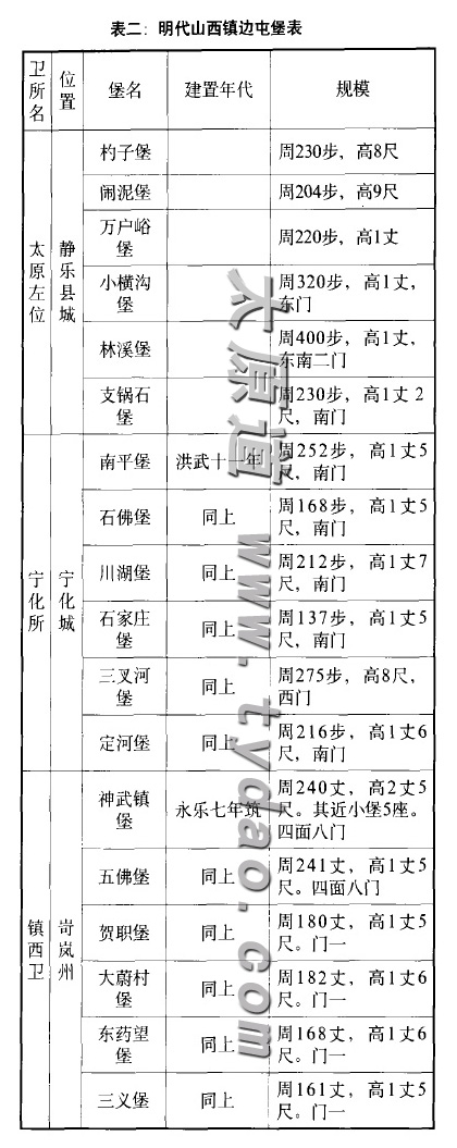 从位置上看,山西镇边在大同镇边之后,起着支撑加固大同镇边,阻敌深入的作用。明际顾祖禹在《读史方舆纪要》中对三关的重要军事地位有精辟的论述,宁武关,“居两关之间”,为“东西要害”;偏关“西接黄河,与套虏仅隔一水”,“三关险要虽同,偏关尤急”;雁门关,是西部“大州之冲”,南部“郡县之路”,“皆为虏冲”。这一镇边“山势连亘,实天造之险固”。为了更有效地抵御蒙古人的侵袭,明朝于此设卫所,开军屯,修边墙,立烽燧,营筑堡寨。有明一代,山西边地究竟修筑了多少堡寨呢?