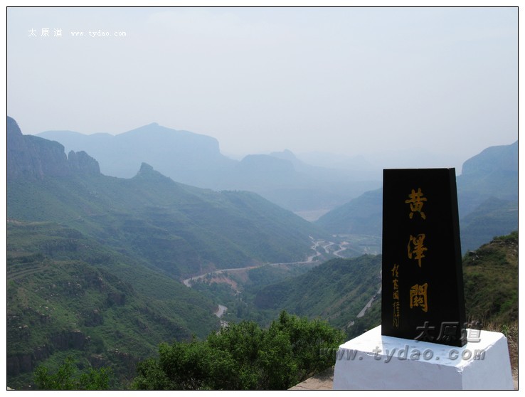 黄泽关古道,远处是黄泽关关门遗址、十八盘公路和胡富国的黄泽关石碑