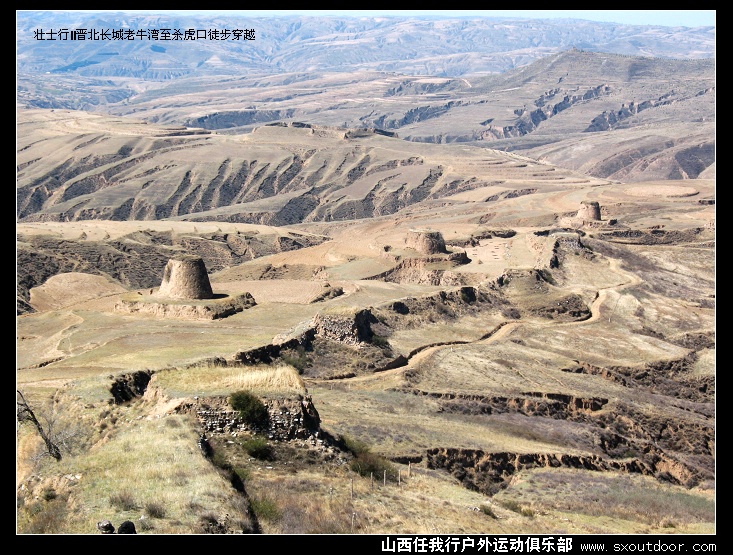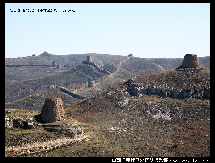 行程:由黄河与长城握手的老牛湾为起点向东挺进,经过内外长城的交汇点柏杨岭,穿越两省四县,行程150公里,最终抵达长城重要关隘杀虎口。