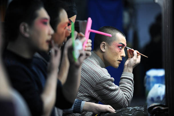 参加第十二届“杏花奖”评选演出的嫦娥剧团演员在后台上妆( 新华社记者范敏达摄) |
