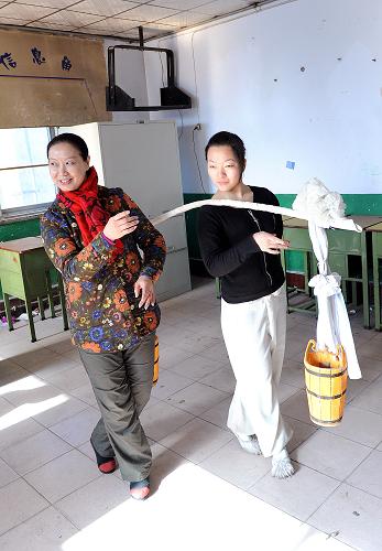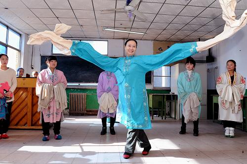 1月28日,在运城市永济县下乡演出前,景雪变(前)为小演员传授水袖功