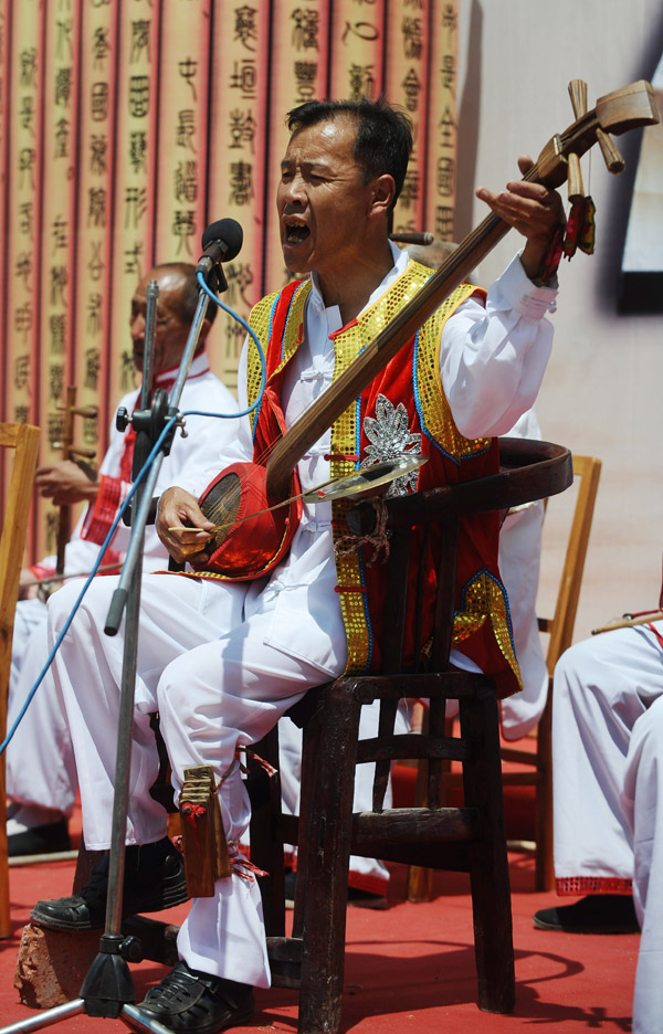 沁县盲人艺术团的艺人栗四文在表演沁州三弦书(2010年6月19日摄) |