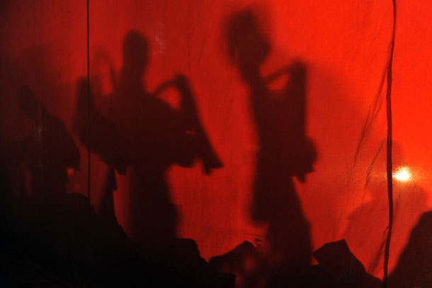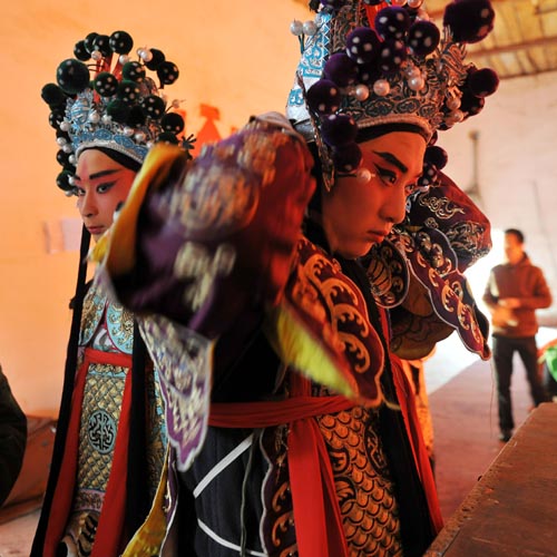 2011年2月18日,在太原市阳曲县大盂镇棘针沟村,太原市实际晋剧院的演员们在表演晋剧折子戏