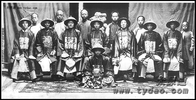 这张照片是我爷爷(中坐者)和他本族兄弟、儿子于1905年拍摄的。我爷爷叫乔殿森,字宝书,号雨亭,山西祁县人,是山西最早的民族工业创始人之一。1902年,我爷爷与同乡渠本翘共同投资在太原三桥街创办了双福火柴公司,并由他担任总经理。1904年,他集股银3万两,在祁县创办了益晋织染有限公司,占地1.9万平方米,织机200台,工人500名。1906年,清政府出卖山西矿权,他积极参与保晋公司的筹办事宜,其中规章制度亲手拟定,如第五条规定“本公司惟收华股,不收洋股”,充分表明了反帝爱国的坚定立场和绝不出卖民族利益的鲜明态度。照片中间一排戴帽子的右二至右六为我爷爷和他的4个亲兄弟,右一和左一为他的叔伯兄弟。后排6个孩子是他的儿子、侄子,右二为我父亲。前排坐着的两个人的身份已无从考证。母亲交给我这张照片时说,照片上方原来写着一行字,但为了把这张照片保存下来,她把那行字剪掉了。 |