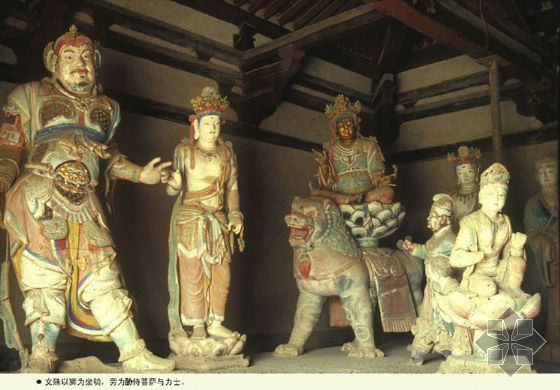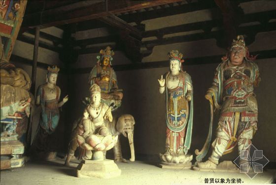 大殿内有一座佛坛,长八点四米,宽六点三米,高零点七米。坛上有唐代彩塑十七尊,非常珍贵。双腿盘坐的释迦牟尼佛像居中,文殊菩萨、普贤菩萨分列左右,天王、金刚矫健有力,童子赤足立地,形象都很生动。佛坛四周,满刻精美的花纹、莲瓣,这是唐代砖雕艺术的珍品。
