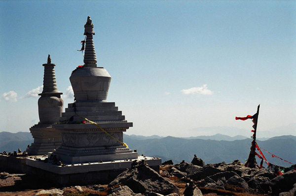 继续前行,出收费站,过进山石牌坊,离开公路,转上土路,我们开始向南台进发。南台距西台近三十公里,它们之间的距离等于其它四个台顶之间距离的总和,许多队员对此并没有心理准备,直到下午三点,队员们才陆续拖着疲惫的身体胜利到达南台顶。南台号称锦绣峰,山花烂漫,绿野如茵,错落有致的灵骨塔仿佛将人带到了西藏。