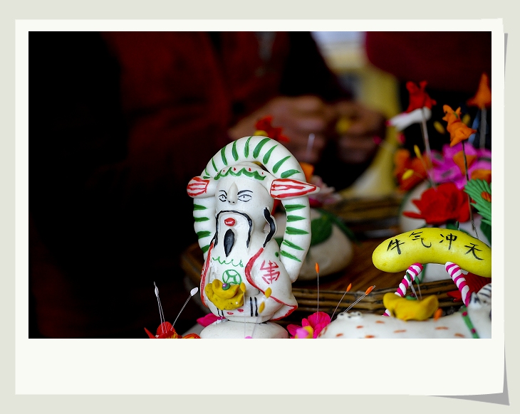 面塑品除制作原料的处理工艺上考究外,在捏、剪、割、揉、夹、压、盘、叠、镶、嵌、组合、压纹、纹花、色调配制也极其讲究。