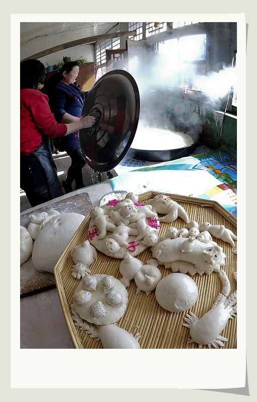 参展者都把自己家做的面塑摆放到一起,造型有动物、花草、人物、吉祥物,题材包括神话故事、民间传说、戏曲剧情,手法多样,风格质朴。面塑展品绵延200多米,一整条街道变成了面塑艺术展示的长廊。