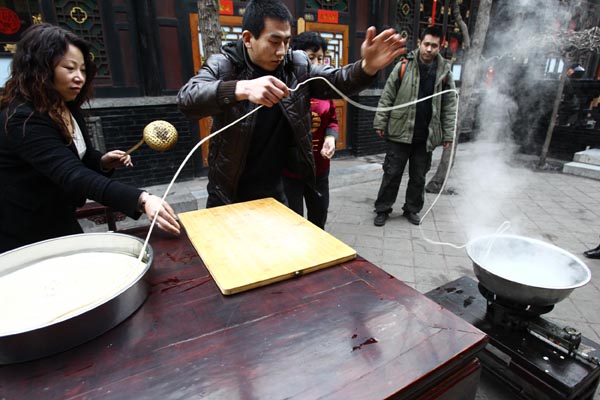 一位小伙在山西平遥古城内的程家老院表演传统山西面食绝活——“一根面”
