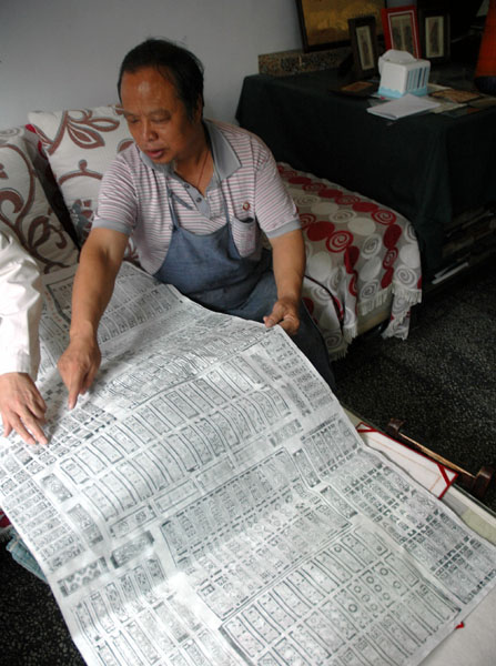 新华社太原10月11日专电(记者王飞航)“我从小就喜欢木版年画,喜欢它厚重的色彩和古朴的线条;后来四处收购搜寻,近二十年里共收集了各个时期的老木版500多块,老年画600多张。”山西新绛县民间艺人吴百锁说。 山西绛州木版年画历史悠久,发端于宋金,兴盛于明清,较杨柳青、朱仙镇、桃花坞年画问世均早,最早见于北宋《佛说北斗七星经》之雕版插图。随着时代的变迁,绛州木版年画逐渐进入了衰落期,原有的作坊均已停产歇业,老版也散失民间,这一传统技艺面临失传的局面。 山西新绛县文化局退休干部吴百锁看到木版年画这一历史文化遗产遭到破坏,十分心痛,下决心挽救这一文化瑰宝。 怀着对木版年画的痴迷,吴百锁先后投资近200万,坚持数十年搜集、整理、保护老版、老画稿、老画卷,他曾多次走访版画老艺人,学习版画制作技艺,致力于保护和抢救绛州木版年画这一珍贵民间文化遗产。“木版年画是中国民间艺术中一笔巨大的遗产,它最清晰地描绘出农耕时代人们的精神天地,最炽烈地展示了老百姓的心灵向往,最缤纷地表达了那个漫长的历史时代社会生活的全貌。越是深入了解这种文化,越是被它的历史感和形式美所吸引。”吴百锁说。 2007年,吴百锁创建成立了绛州木版年画研制所,专门从事绛州木版年画的收集、整理、研究、创作工作。截至目前,吴百锁已收藏各个时期的古版500余块、老画600余幅,最早的可以追溯到明代,其中有46版、画被录入《中国木版年画集成·绛州卷》一书中;他制作完成的最小的绛州木版年画比拇指还小,最大的《福禄寿三星》作品长宽近2米。 2008年初,中国民间文艺家协会主席冯骥才在新绛县考察绛州木版年画后认为,绛州木版年画品种繁多,手法齐全,雕版技术精湛、线条细腻,年画内容所能体现的历史脉络清晰,是一项完整的民间文化遗产。“绛州木版年画现已列入山西省非物质文化遗产,正申报国家非物质文化遗产,政府对这一块非常重视,我自己的木版年画研制所在传承绛州木板年画的同时,也已培养了十余名传承人,我们有信心使绛州木版年画这一民间奇葩重新焕发生机。”吴百锁说。