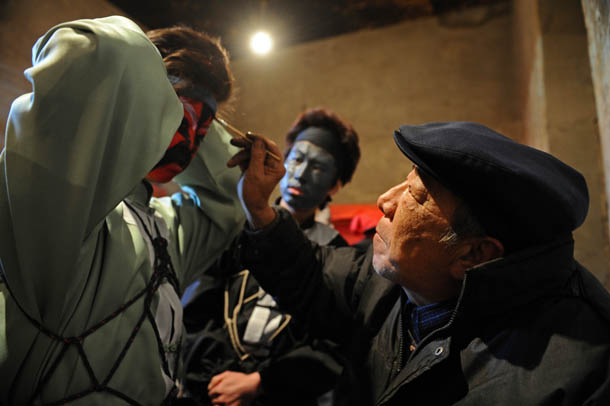 化妆师傅在给将参加社火表演的村民化妆 |