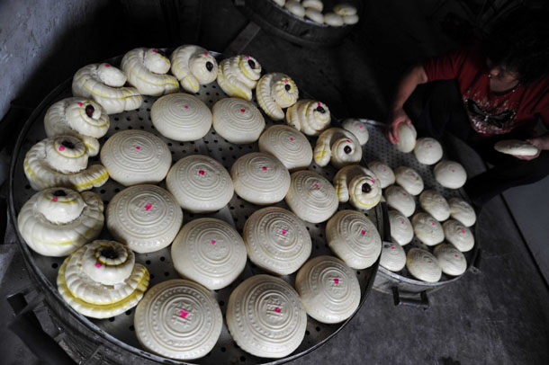 2011年9月10日,在山西运城市新绛县泽掌村一家蒸馍店,一名村民在摆放蒸好的传统面食月饼和菊花馍