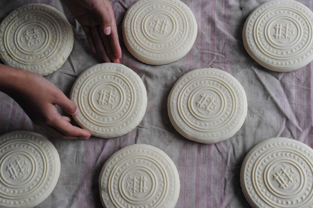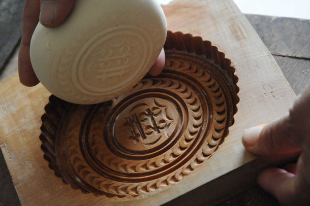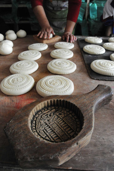 9月10日,在山西运城市新绛县泽掌村一家蒸馍店,一名村民在用木质传统月饼模具制作面食月饼 |