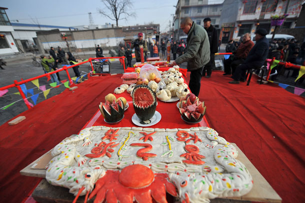2012年2月23日,在太原市晋源区一年一度的龙天庙会上,游客在欣赏晋阳花馍