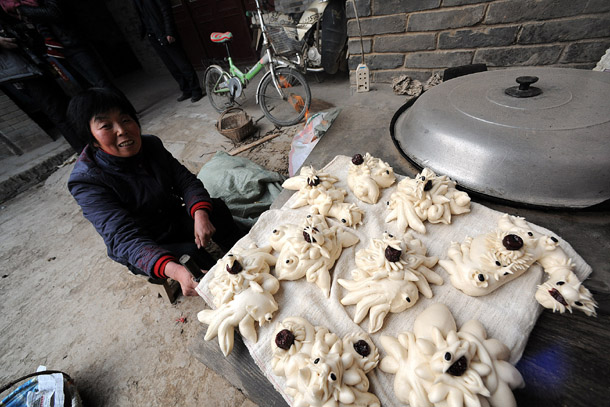 2012年1月27日,芮城县东历山村村民任莲凤(左)按照习俗将刚出锅的芮城花馍送给邻居