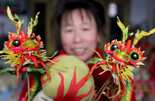 2011年12月27日,山西省万荣县民间艺人解云仙用时3天,用125公斤的面制做成212个大小不同、形状各异的"万荣花馍",并将它们拼成两条各3米长的面塑“巨龙”,喜迎农历龙年的到来。
