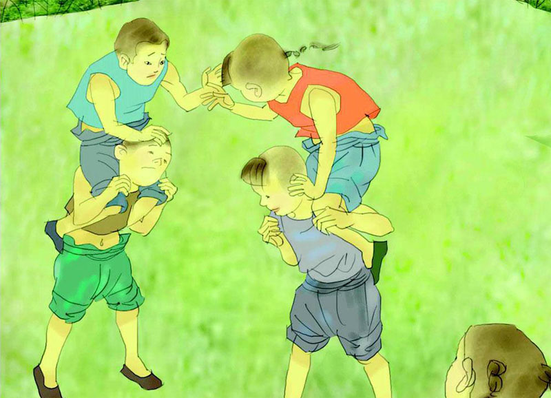 02:跳绳 05:滚铁环 08:抓石子 11:摸瞎瞎 14:翻鞋鞋 17:玩弹弓 20:摔跤 23:打腿 26:吹肥皂泡 29:木头人 32:穿杨树叶与“斗草” 35:猜谜语 38:骑竹马 41:捞金鱼与转板凳 44:憋“茅坑” 47:拔河 50:翻羊骨节 53:养麻雀 56:找“替死鬼” 59:玩弓箭 62:抖空竹 65:丢手绢 68:击掌与掰手指 |